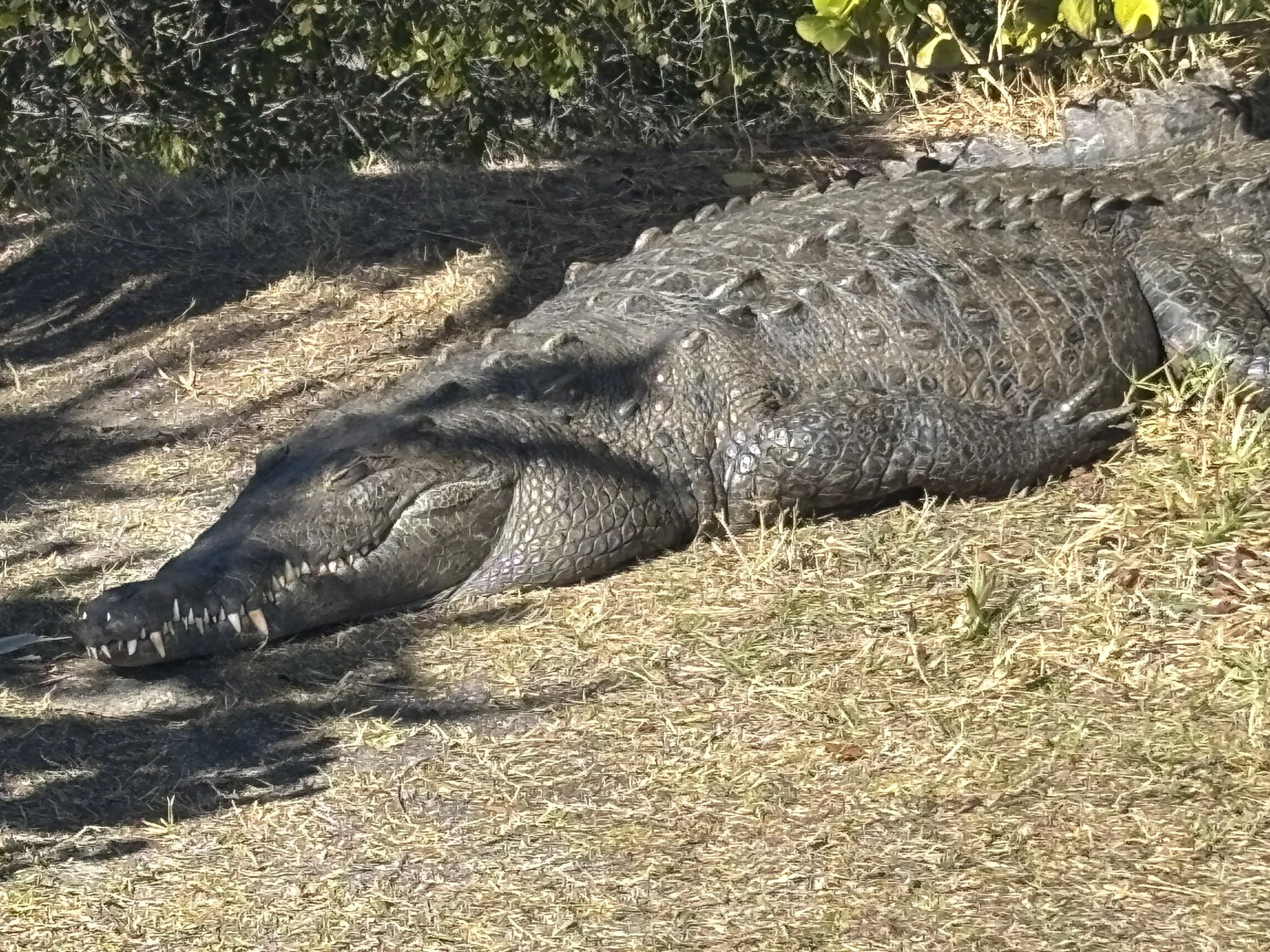 Our second Everglades adventure was a 15-mile bike ride through Shark Valley. If you want to see alligators up close, in the wild, this is a must do. During the few hours we were there, we saw dozens, if not scores, of alligators, and one really big American Crocodile! The gators ranged in size from 12” babies to 12’ monsters. And “up close” in this case meant “don’t run over that one’s tail!” At one point, we got off our bikes to do a short hike, but about 40’ up the trail, we came upon a ~8’ gator lying in the middle of the path. ( Image Below) We were out!! And quickly decided there and then that biking was better than hiking!