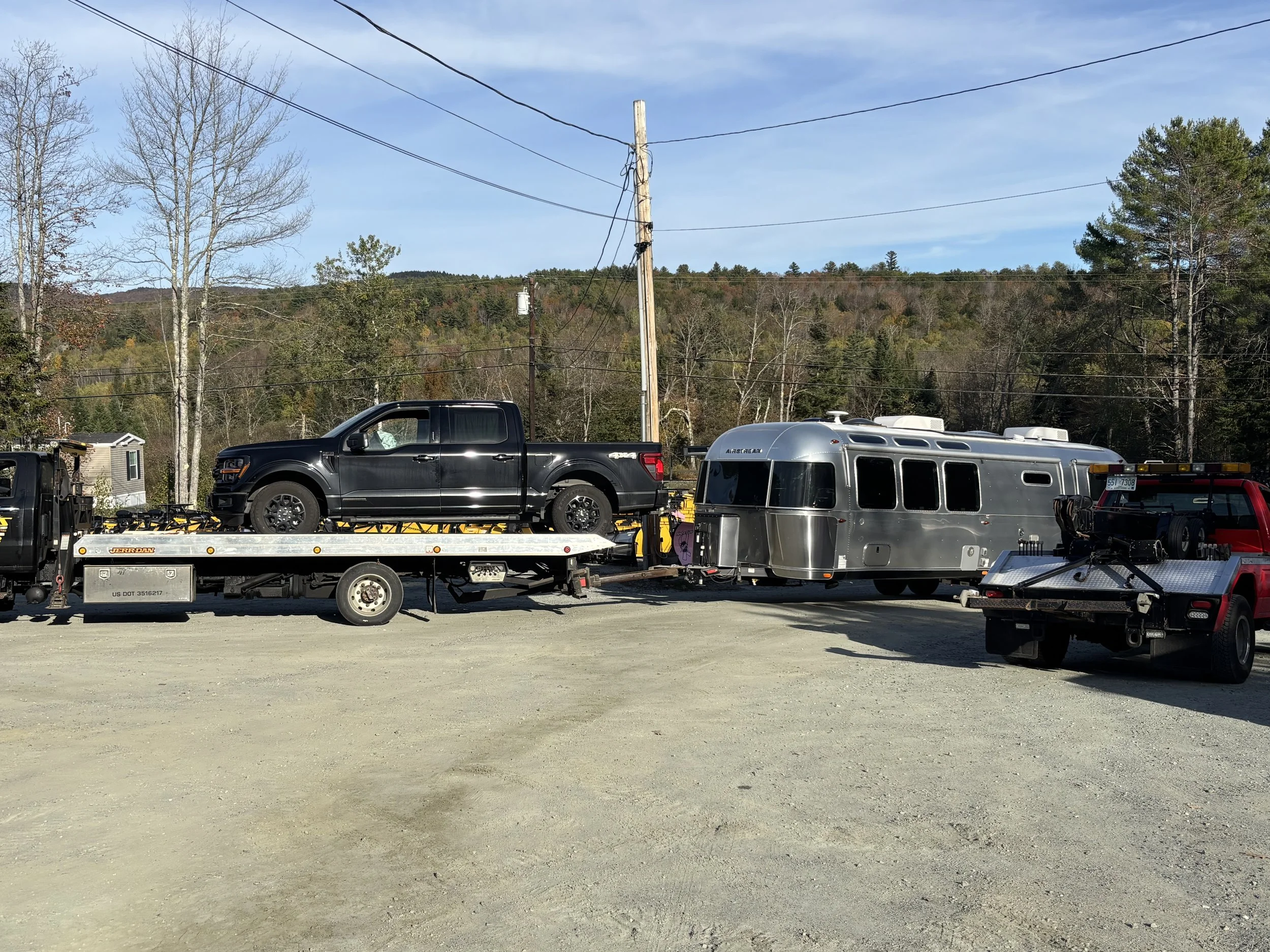 Our original plan was to be in New Hampshire for a few days and then move onto northwestern Massachussets. However, the accident left us with an undrivable truck and no way to haul our trailer to the next campground, let alone to Massachusetts. Fortunately, the owner of the tow truck company saw we were up a creek with no paddle and used his personal truck to haul us to our site. First problem solved. The next day our goal was to rent a vehicle, and not just any vehicle. It had to be a truck capable of hauling our Airstream.