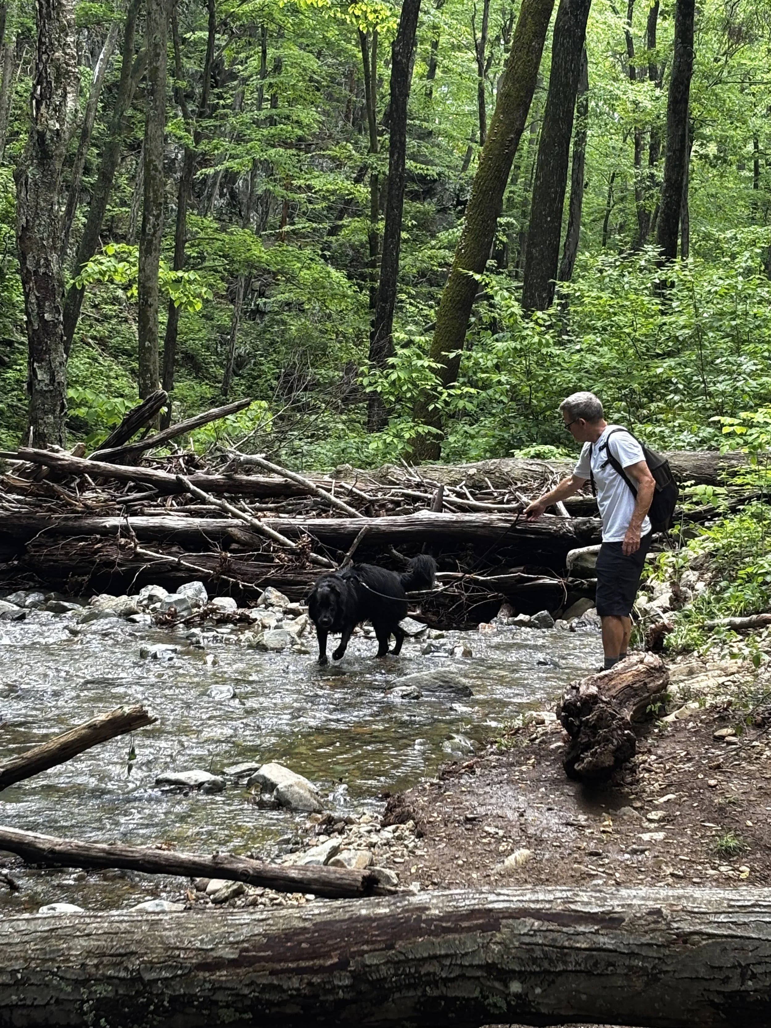 After a brief picnic lunch which ended with us losing a battle with a giant swarm of gnats, we headed to the Rose River Falls trail. Our objective was to see a nearly 70’ high waterfall. Most of the hike ran along the edge of the river. Due to the rainfall, the river was roaring like a lion, and the water was in full force. The river cascaded through the valley for nearly two miles. At several points, walking the trail was basically like walking in a creek as there was so much water. This was the perfect scenario for Mack. He spent so much time in the puddles, creeks, and pools of the river, we decided his personal motto must have been: