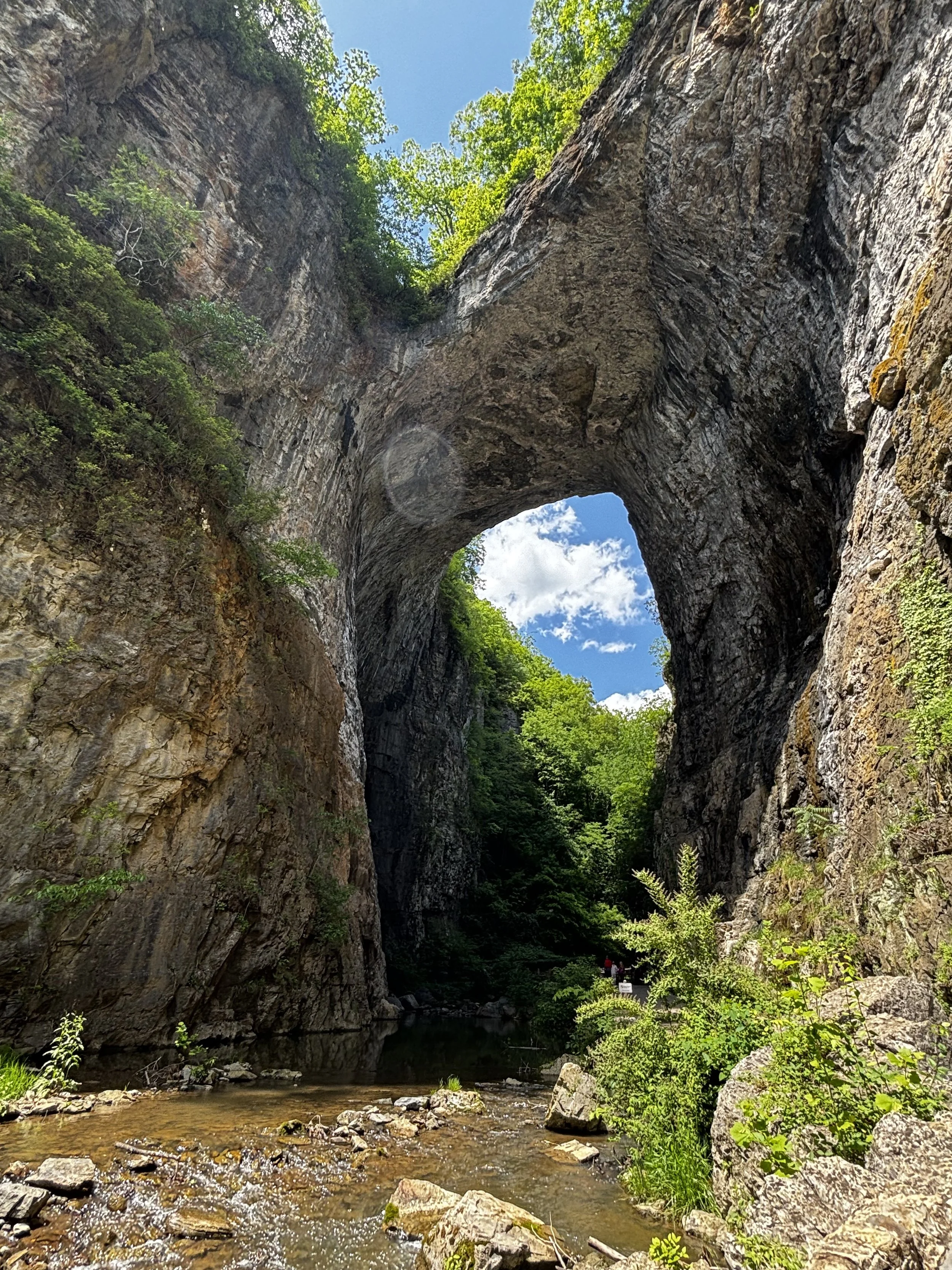 Natural Bridge State Park lies just south of Lexington. It features North America’s largest natural bridge at 215’ high and 90’ across. It is impressive. “WOW” just jumped from our lips when we first saw it. Legend has it that George Washington once surveyed the area of the bridge, and it is a historical fact that it was, at one time, owned by Thomas Jefferson who purchased it from the King of England in 1774. In addition to the bridge, the state park includes an abandoned saltpeter mine that was used to make gunpowder during both the revolutionary and civil wars, a lost river that flows beneath and behind the limestone walls of the valley, and a lovely little waterfall.